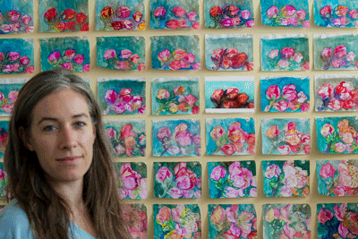 Anne Beal poses beside her piece, Wall Flowers, dozens of 4.5”x6” watercolor paintings that make up an animation Anne created in 2018.